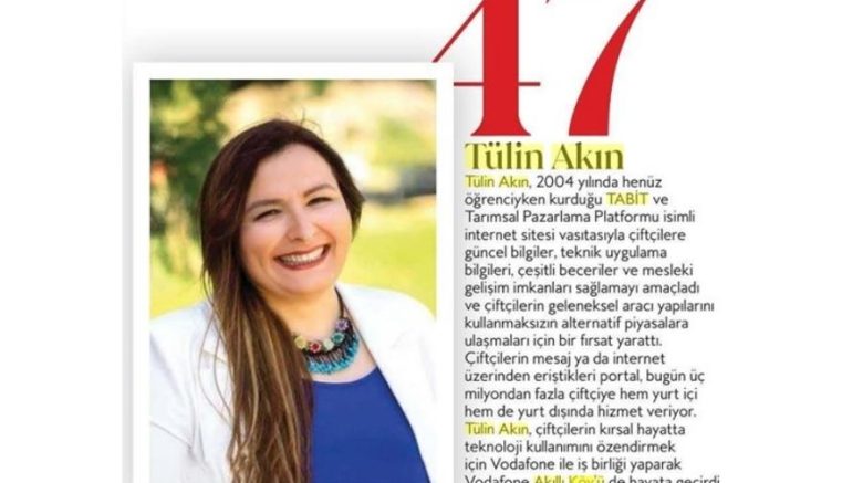 Tülin Akın, 2004 yılında henüz öğrenciyken kurduğu TABİT Tarımsal Pazarlama Platformu isimli internet sitesi vasıtasıyla çiftçilere güncel bilgiler, teknik uygulama bilgileri, çeşitli beceriler ve mesleki gelişim imkanları sağlamayı amaçladı ve çiftçilerin geleneksel aracı yapılarını kullanmaksızın alternatif piyasalara ulaşmaları için fırsat yarattı. Çiftçilerin mesaj ya da internet üzerinden eriştikleri portal, bugün üç milyondan fazla çiftçiye hem yurt içi hem de yurt dışında hizmet veriyor. Tülin Akın, çiftçilerin kırsal hayatta teknoloji kullanımını özendirmek için Vodafone ile iş birliği yaparak Vodafone Akıllı Köy’ü de hayata geçirdi ve bu alanda projelerini sürdürüyor.